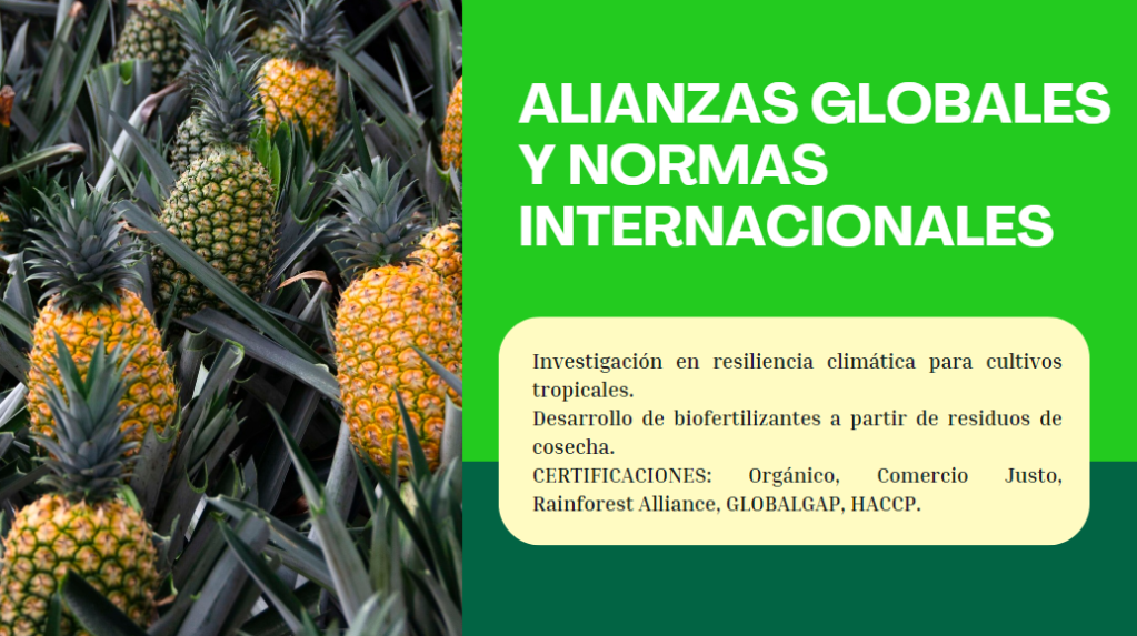 Prácticas eco-responsables para responder a las exigencias europeas (Global GAP, BIO, Comercio justo). Reducción de la huella carbono con el circuito de exportaciones optimizado: transporte marítimo mejorado, logística verde, etc.).
